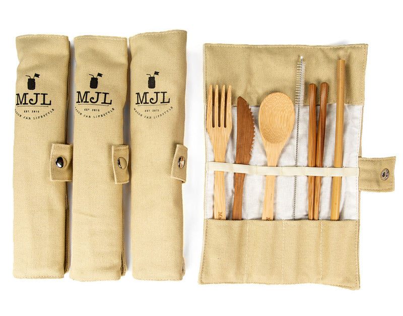 Includes: fork, spoon, knife, straw with cleaning brush, and a pair of chopsticks, cotton carrying case.