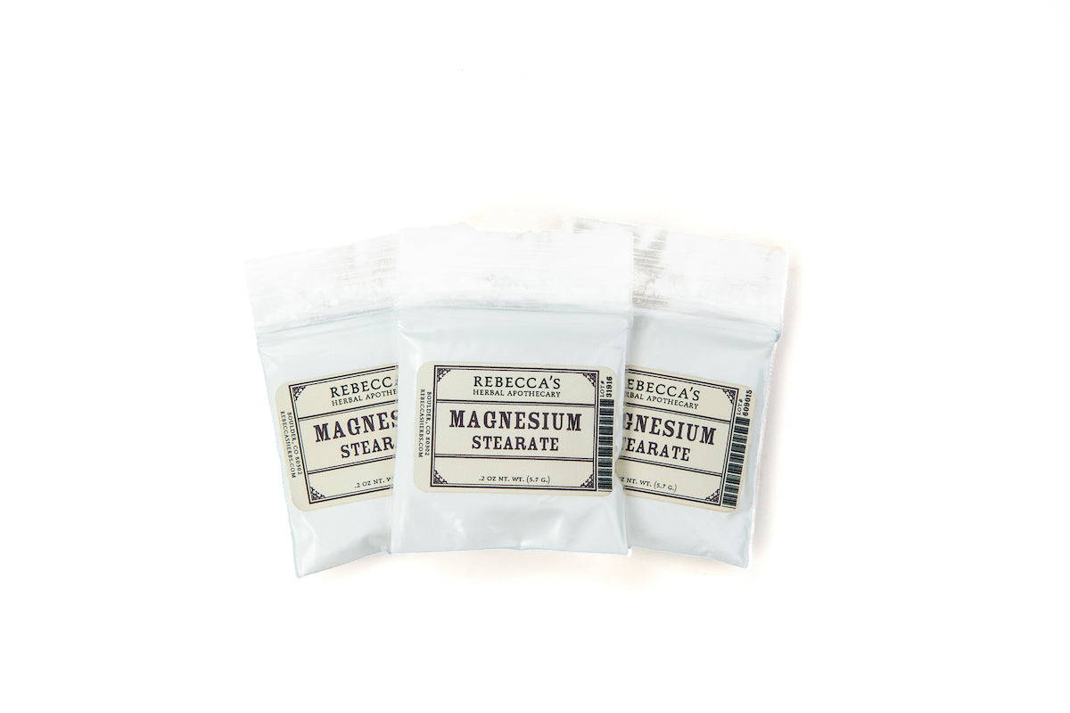 A chemical compound of magnesium and stearic acid, magnesium stearate is derived from vegetable oil. It is used as an anti-caking, binding, thickening, and gelling agent. In addition to being soluble in warm alcohol, it may be dispersed in oil or water, and added to recipes requiring opacity and viscosity.