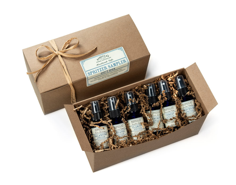 The Spritzer Sampler Gift Box is a beautiful aromatherapy sampling. This box contains 6 of our most loved aromatherapy spritzers: Balancing Spritzer, Breathe Spritzer, Clarity Spritzer, Forest Spritzer. Grounding Spritzer and Queen of Hungary Spritzer.