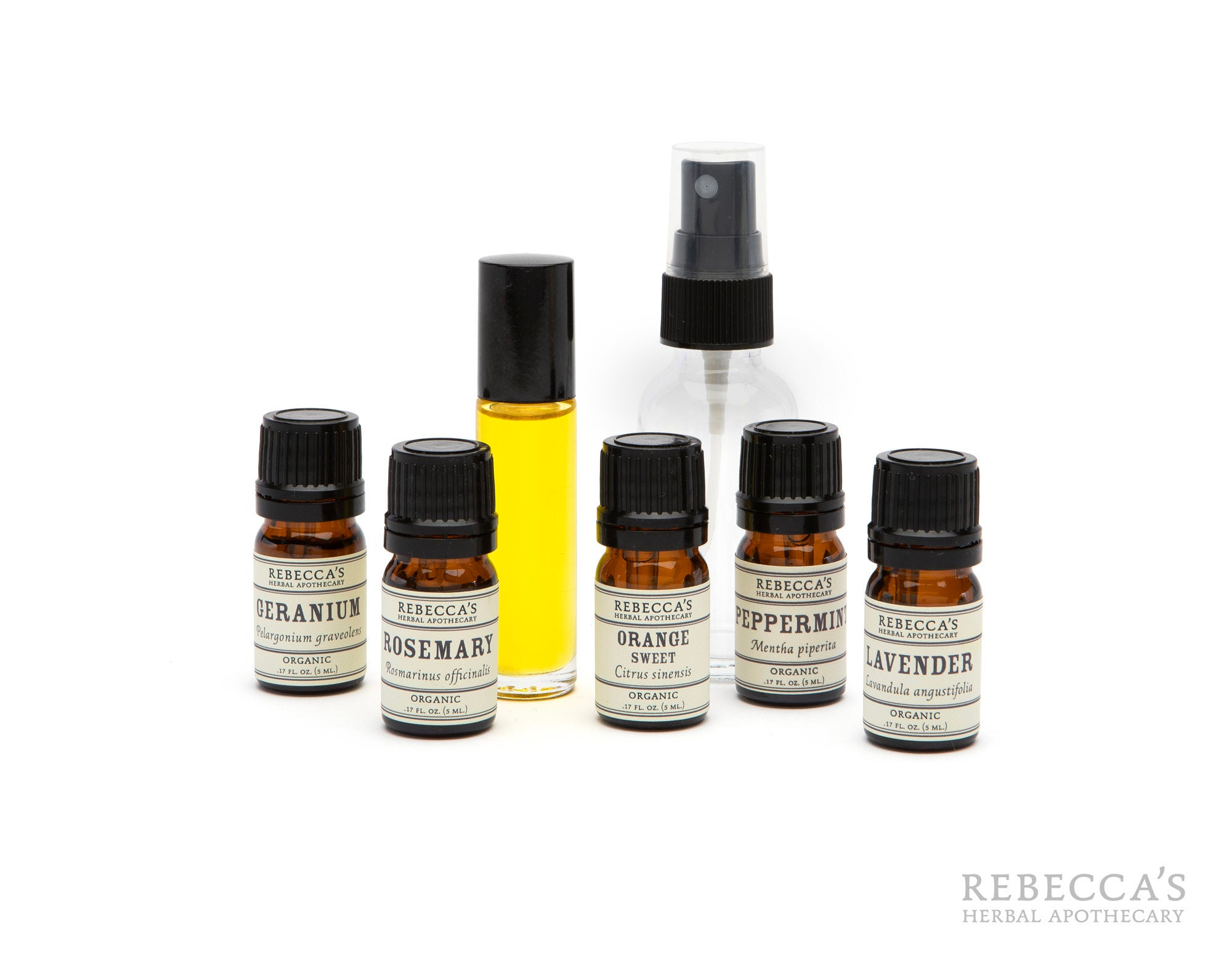 5 ml Peppermint, 5 ml Rosemary, 5 ml Geranium, 5 ml Orange, 5 ml Lavender, a roller bottle filled with Organic Jojoba Oil, and a 2 oz glass bottle with spray top.