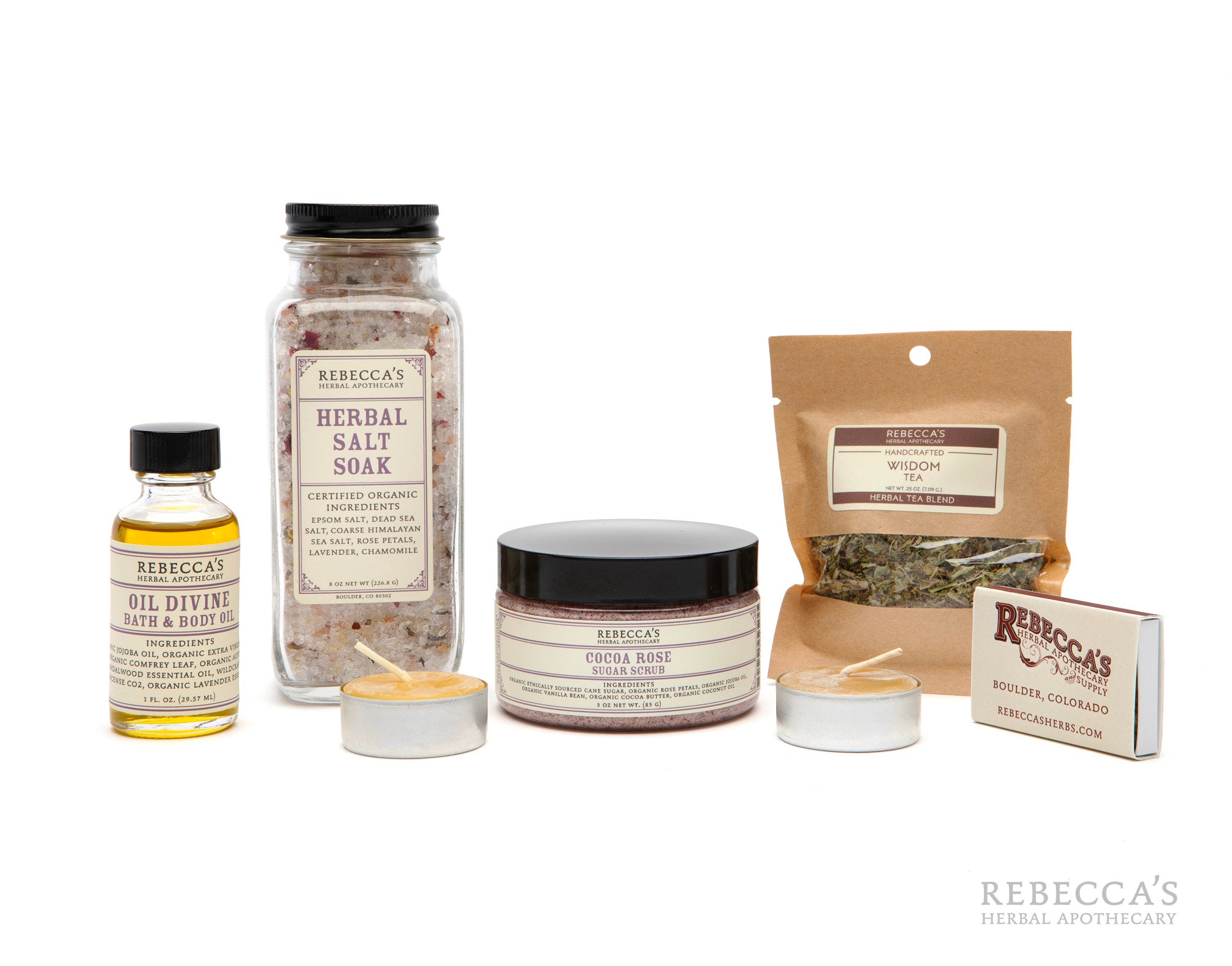 Herbal Salt Soak, Cocoa Rose Sugar Scrub, Oil Divine Bath and Body Oil, Wisdom Tea Sample, two beeswax tea lights